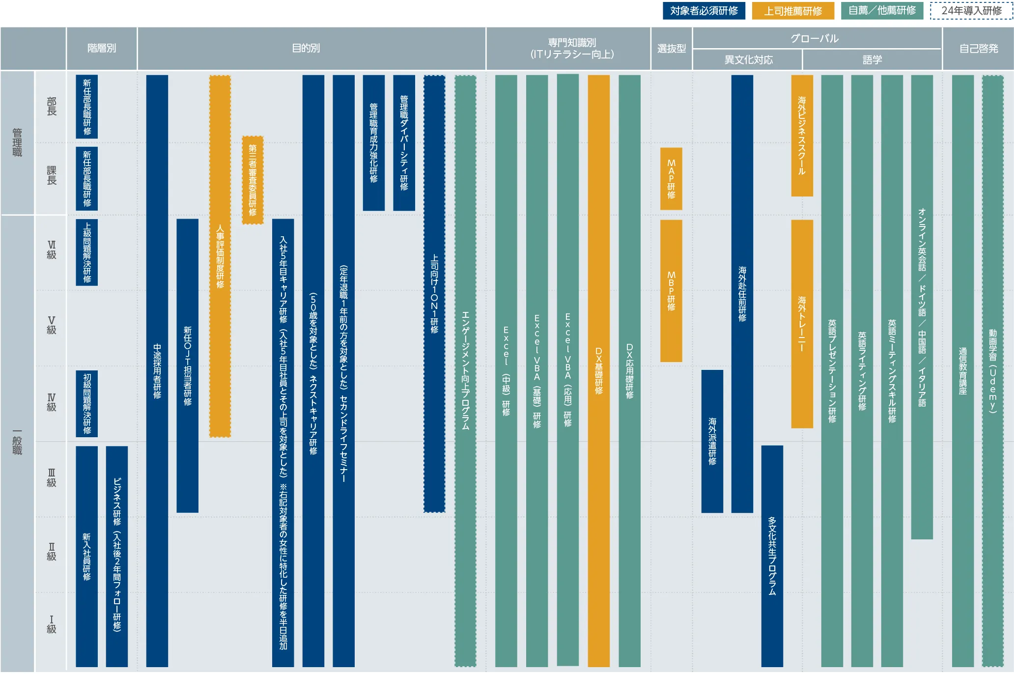 当社の成長に欠かせないグローバルな事業展開をリードする人財を排出するために、幅広い階層に対応した教育体系を整備しています。キャリア早期から自身のキャリアに「グローバル」を位置づけ、成長意欲や挑戦への姿勢を持ってもらうため、特に若年~中堅層への教育を充実させています。