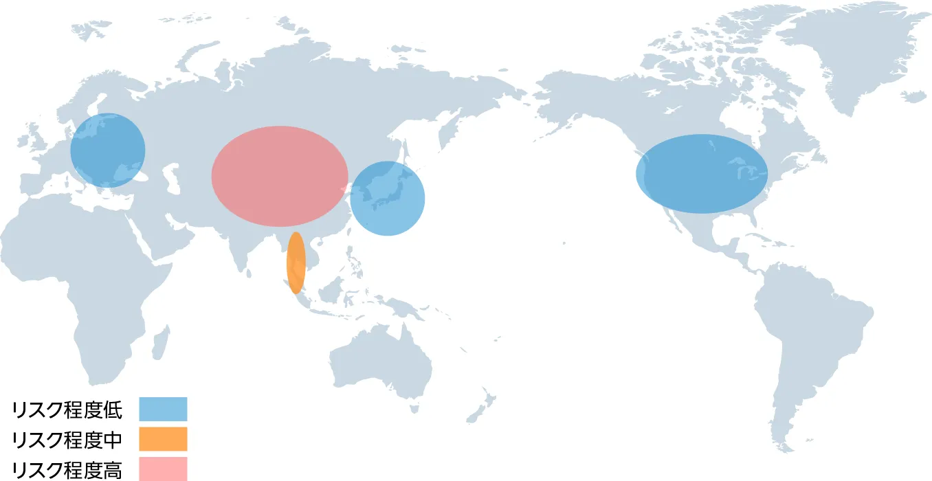 当社グループは、サプライチェーン内で潜在的な人権と環境のリスクを抱える地域を明らかにし、それらのリスクの分布を次のように識別しました。