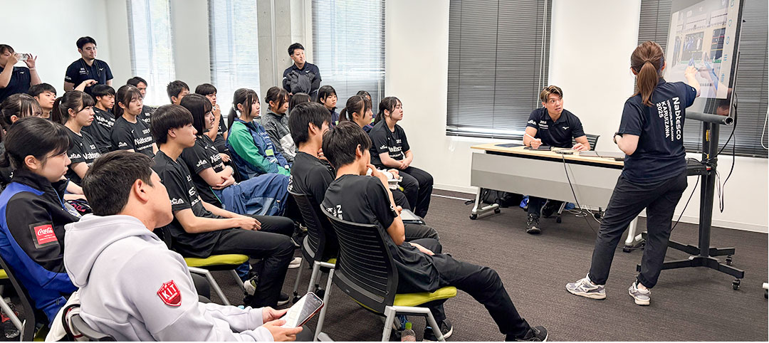 開校式を行ったあと、「メンタルとは何か」をテーマに座学を実施。試合で自分の力を最大限発揮するために必要なこととして、「ミスの理由をメンタルにしない」という考え方を学びました。試合中の具体的なシーンを想定したケーススタディを行い、さらにグループワークを通じて自分の感情を言語化する練習を行いました。講師の小笠原歩コーチは「メンタルとは、思考と感情を整理すること」「1つのミスで自分を下げ、自信を失うのはもったいない。今まで練習してきた自分を信じて、最後までプレーしてほしい」とジュニア選手に伝えました。